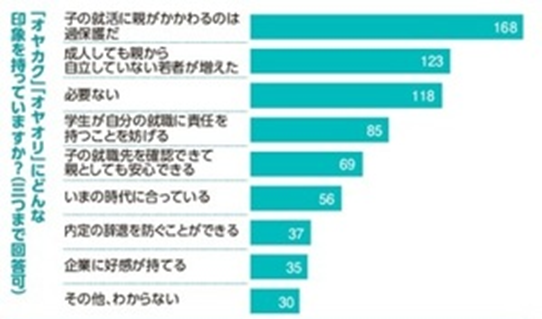 朝日新聞デジタルではオヤカクについて読者アンケートを実施。「オヤカク」「オヤオリ」にどういう印象を持っていますか、という質問に対し(3つまで回答可)一番多かった答えは「子の就活に親がかかわるのは過保護だ」(49.9%)、ついで「成人しても親から自立していない若者が増えた」(36.5%)でしたが、「子の就職先を確認できて親としても安心できる」という回答も20.5%ありました。